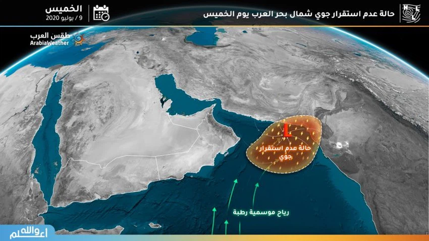 طقس العرب - يراقب كادر التنبؤات الجوية في طقس العرب النشاط المداري المتمركز حالياً وسط بحر العرب، حيثُ تظهر آخر صور الأقمار الإصطناعية كميات ضخمة من السُحب الرعدية الماطرة، والتي تترافق برياح قوية تصل سرعة هباتها إلى حدود 100 كم/ساعة.