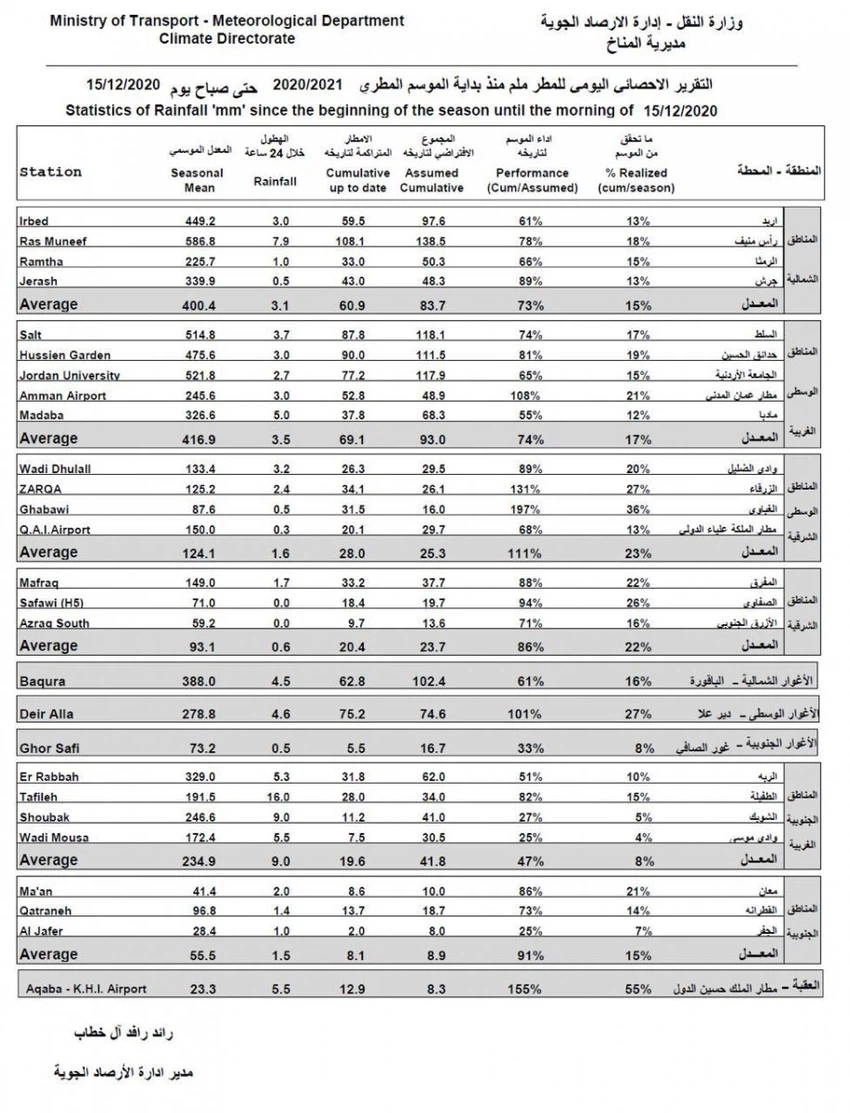 وقد ترافقت هذه الجبهة الهوائية الباردة مع هطول لزخات من الأمطار الرعدية الغزيرة في بعض النطاقات الجغرافية مما تسبب في ارتفاع منسوب المياه في بعض المناطق ، وشملت الأمطار الغزيرة مدينة العقبة جنوب الأردن