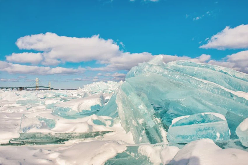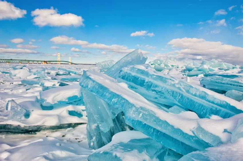 ويمكن رؤية هذا الجليد الأزرق المذهل في أي من البحيرات العظمى، ولكنه أكثر شيوعًا عند الجزء القريب من مضيق ماكيناك، بسبب نقاء الجليد وسماكته التي تتشكل عادة في هذه المنطقة.