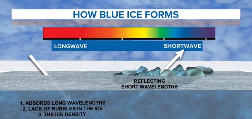 يعمل الجليد السميك الخالي من الفقاعات على امتصاص الألوان ذات الطول الموجي الطويل أكثر، هذا يعني أن اللون البرتقالي والأصفر والأحمر لا تعد مرئية، ولا يتبقى من طيف الألوان المرئية سوى الألوان ذات الطول الموجي القصير، وهي التي تنعكس إلى أعيننا، فيظهر الجليد بمزيج رائع من اللون الأخضر والأزرق والأرجواني، لكن تميل أعيننا إلى تمييز اللون الأزرق أكثر.