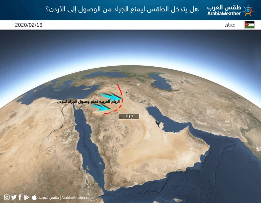 أكد فريق التنبؤات الجوية في طقس العرب، أن فرصة وصول الجراد الى المملكة خلال الأيام المقبلة ستكون ضعيفة؛ بسبب حركة الرياح وبرودتها المتوقعة اعتبارًا من ليل اليوم الثلاثاء وحتى الاسبوع المقبل.