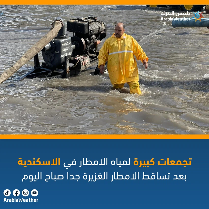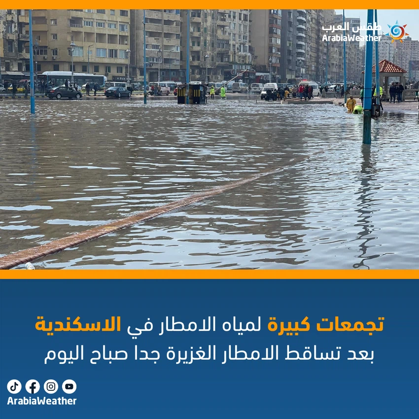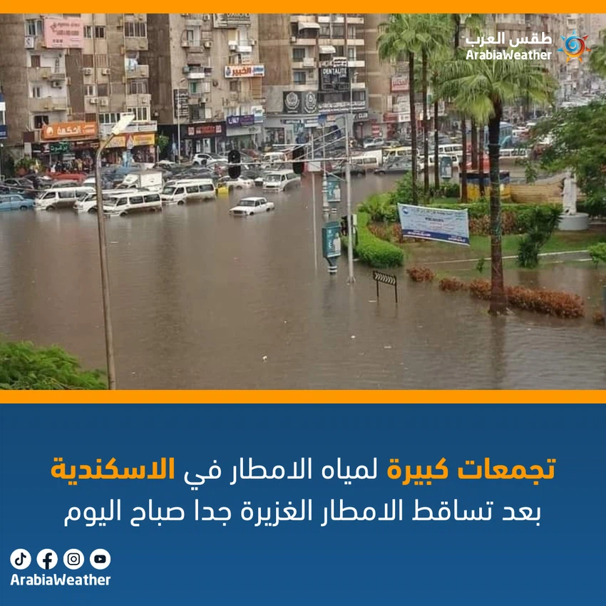 طقس العرب - تأثرت الجمهورية بحالة من عدم الاستقرار الجوي ناتجة عن تمركز لمنخفض جوي قبالة السواحل الشمالية، مع امتداد منخفض البحر الأحمر، وشهدت الإسكندرية خلال الأيام الماضية وحتى نهار اليوم هطول الأمطار، التي كانت رعدية وغزيرة مما تسبب بحدوث السيول وارتفاع منسوب المياه في الطرقات.