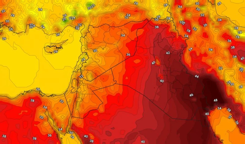 تتراجع الكتلة الهوائية مُعتدلة الحرارة التي أثرت على بلاد الشام خلال الأيام الماضية غرباً أي بعيداً عن المنطقة بدءاً من نهار الخميس، لتندفع تيارات هوائية حارة قادمة من صحراء شبه الجزيرة العربية جالبتاً معها ارتفاع مُتصاعد على درجات حرارة تفوق مُعدلاتها العامة بقليل، لتكون العظمى مع نهاية الأسبوع في منتصف الثلاثينيات مئوية في معظم المدن الرئيسية، ويسود طقس صيفي حار نسبياً في المرتفعات الجبلية بينما يكون حارّ بشكل لافت في المناطق الصحراوية والمنخفضة.