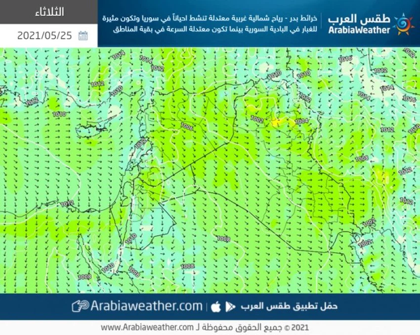 طقس العرب - يسود طقس ربيعي اعتيادي يوم الثلاثاء، بعد أن عاشت البلاد على واقع أجواء أقرب ما تكون للمُعتدلة، حيث يكون الطقس ربيعي دافئ في الجبال، وحاراً نسبياً في باقي المناطق، ودرجات الحرارة حول معدلاتها نسبةً لمثل هذا الوقت من العام، كما تتشكل غيوم متوسطة وعالية شمال وشرق سوريا قد تعمل على هطول زخات عشوائية رعدية من المطر ظهراً وعصراً، وتكون الرياح شمالية غربية مُعتدلة السرعة، تنشط احياناً وتكون مثيرة للغبار في البادية السورية.