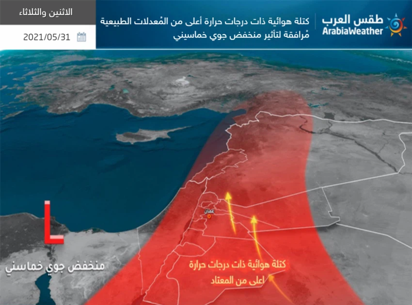 ومع اقتراب المنخفض الجوي الخماسيني أكثر نحو البلاد، ليتمركز يوم الثلاثاء فوق الأراضي السورية، يُرافق هذا المنخفض نشاط واضح على حركة الرياح المُثيرة للغبار والأتربة في بعض المناطق لاسيما المناطق الصحراوية الواقعة في جنوب وشرق الأردن وشرق سوريا.
