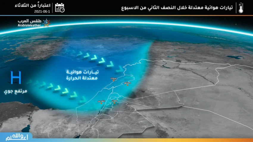 ولا يتوقع بحسب التقديرات الحالية، أن تتعرّض بلاد الشام لأي كتلة هوائية حارة خلال الأسبوع الحالي على الأقل، نتيجة لاستمرار تأثر المنطقة بالكُتلة الهوائية مُعتدلة الحرارة طيلة أيام الأسبوع والفترة القادمة بحيث يسود طقس صيفي مُعتدل الى اعتيادي نهاراً يتحول الى لطيف مائلاً للبرودة خلال ساعات الليل والصباح الباكر في معظم المُدن الرئيسية.