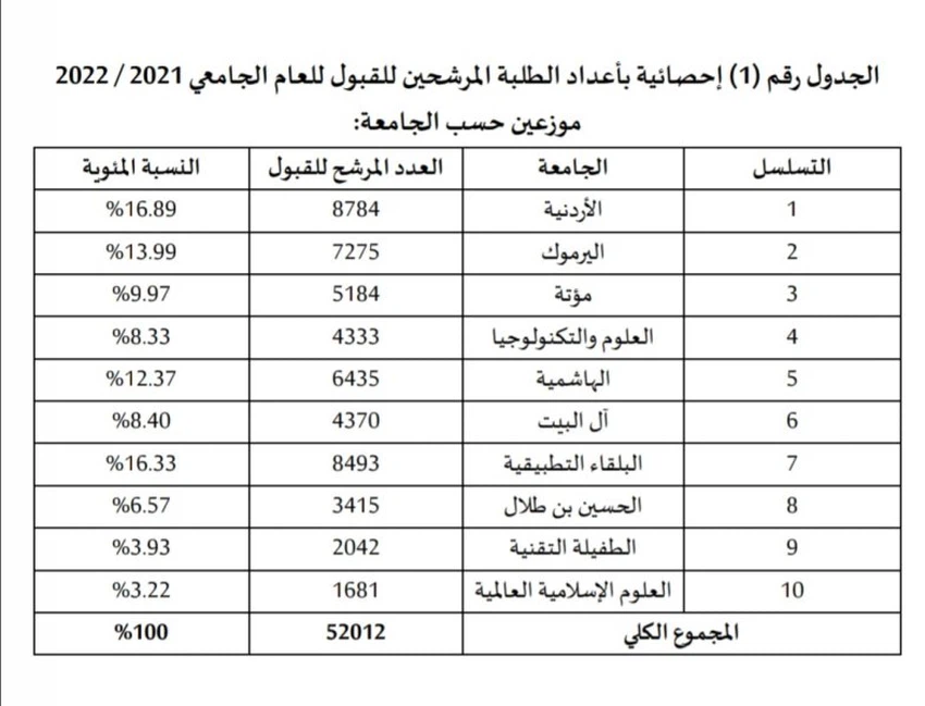 طقس العرب - أعلنت وحدة تنسيق القبول الموحد في وزارة التعليم العالي والبحث العلمي، بأن عدد الطلبة المقبولين للسنة الحالية 2021 / 2022، بلغ (52012) طالبًا وطالبة في الجامعات الرسمية، وأن الحد الأدنى لمعدل القبول التنافسي في الطب للثانوية الأردنية بلغ (93.55 بالمئة).