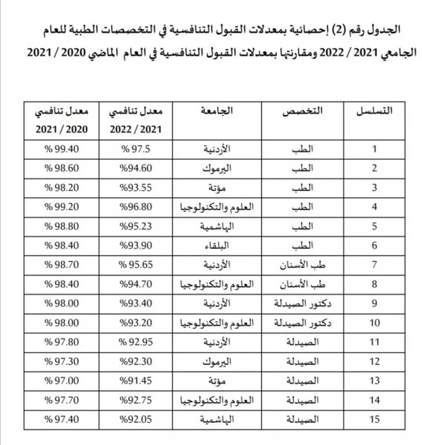 وأوضحت الوزارة، أن الجدول رقم (1) المرفق صوره له يبين إحصائية بأعداد الطلبة المرشحين للقبول للعام الجامعي 2021 – 2022 موزعين حسب الجامعة، ويبين الجدول رقم (2) الموفق صورة له إحصائية بمعدلات القبول التنافسية في التخصصات الطبية للعام الجامعي 2021 – 2022 ومقارنتها بمعدلات القبول التنافسية في العام الماضي 2020 / 2021.