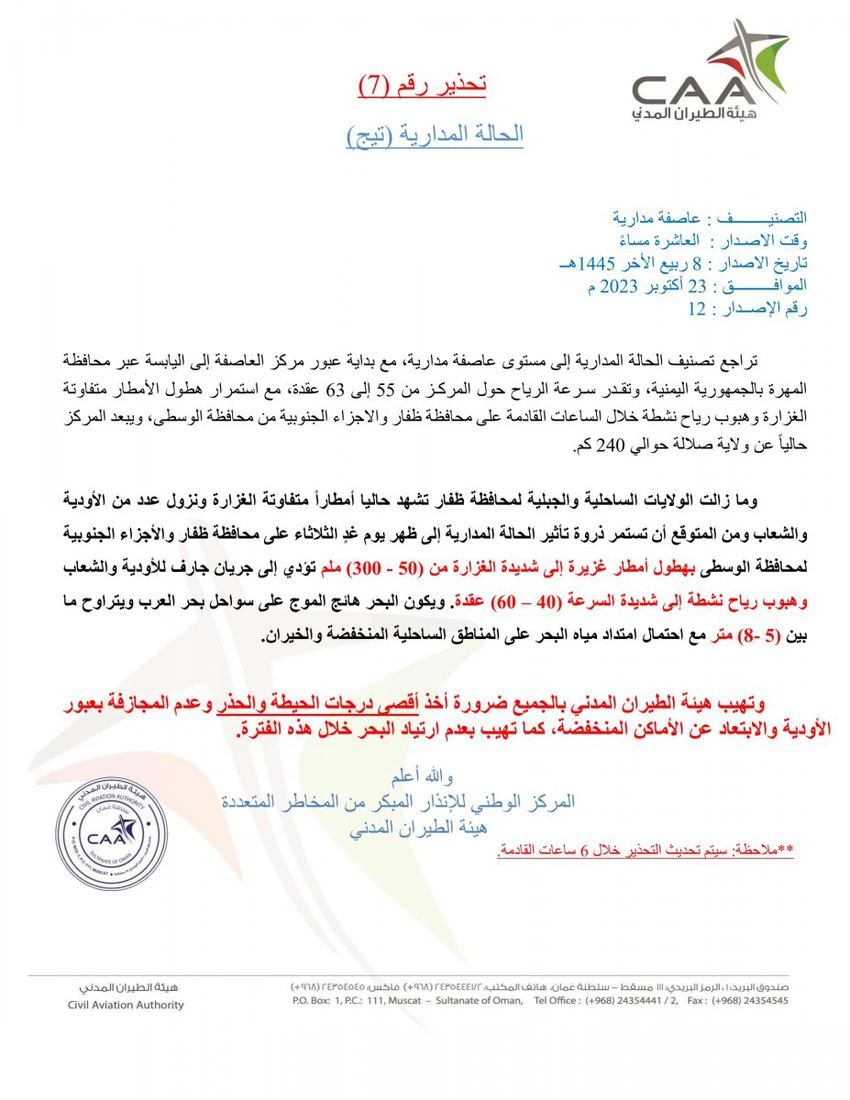 وتالياََ تفاصيل ما جاء في التحذير رقم 7 الذي أطلقته الارصاد العمانية للإنذار المبكر: