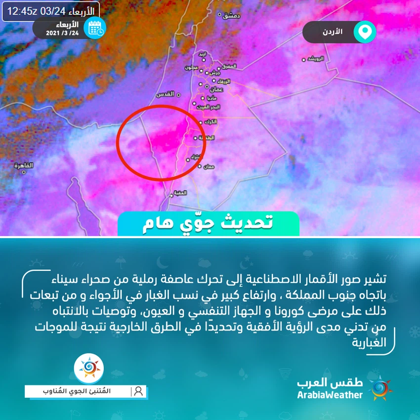 تشير صور الأقمار الاصطناعية إلى تحرك عاصفة رملية من صحراء سيناء باتجاه جنوب المملكة ، وارتفاع كبير في نسب الغبار في الأجواء و من تبعات ذلك على مرضى كورونا و الجهاز التنفسي و العيون، وتوصيات بالانتباه من تدني مدى الرؤية الأفقية وتحديدًا في الطرق الخارجية نتيجة للموجات الغُبارية.