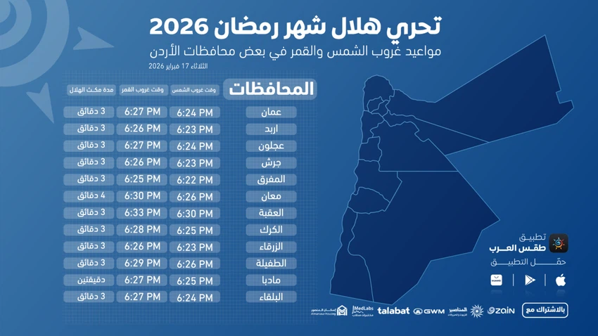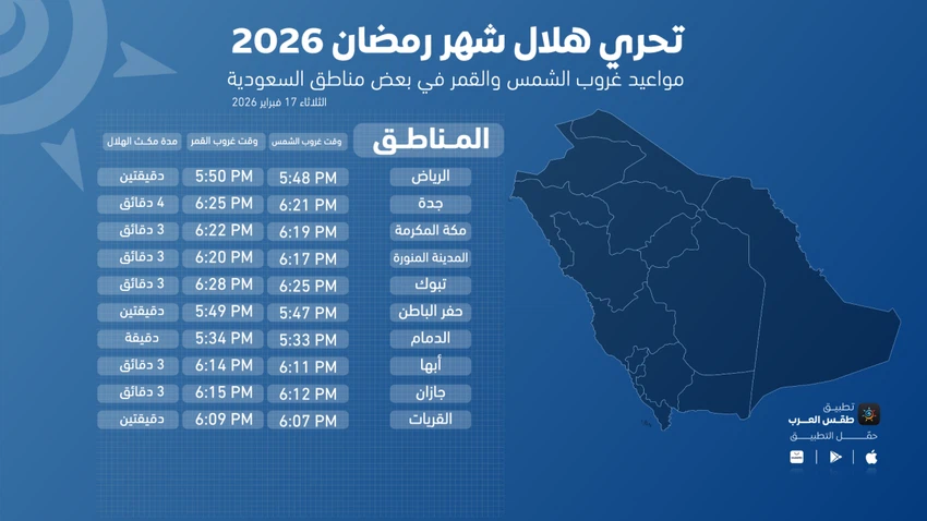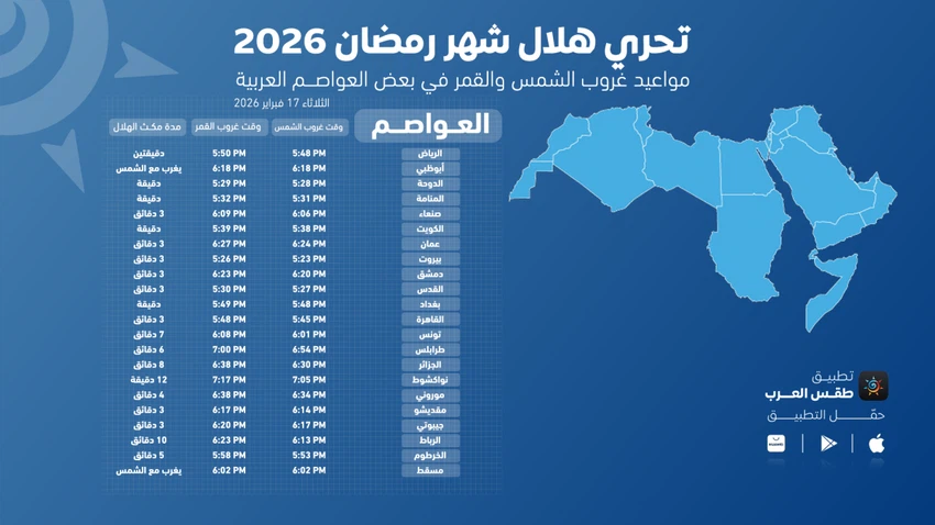 طقس العرب - تتحرى الدول العربية والإسلامية مساء اليوم الثلاثاء 17 فبراير 2026 هلال شهر رمضان 1447هـ، وسط مؤشرات فلكية ترجح صعوبة أو استحالة الرؤية في عدد من الدول، فيما يُنتظر الإعلان الرسمي بعد مغيب الشمس لحسم ما إذا كان الأربعاء 18 فبراير أول أيام رمضان أم تُستكمل عدة شعبان.