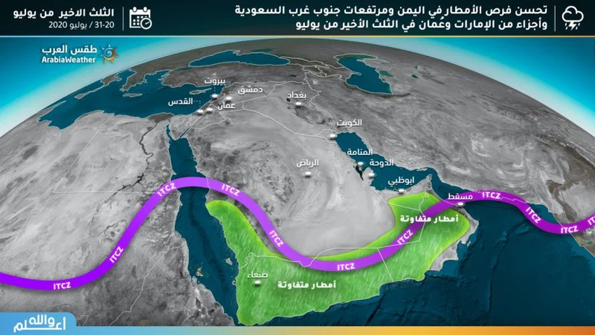 طقس العرب – سنان خلف –تُشير آخر التوقعات الجوية مُتوسطة المدى والصادرة عن كادر التنبؤت في طقس العرب إلى عودة فرص تشكل السُحب الرعدية وتساقط الأمطار في الأجزاء الجنوبية والجنوبية الغربية من شبه الجزيرة العربية، وتشمل أجزاء من سلطنة عُمان والإمارات، إضافة إلى السعودية اليمن، وذلك خلال الثلث الأخير من شهر يوليو بمشيئة الله تعالى.