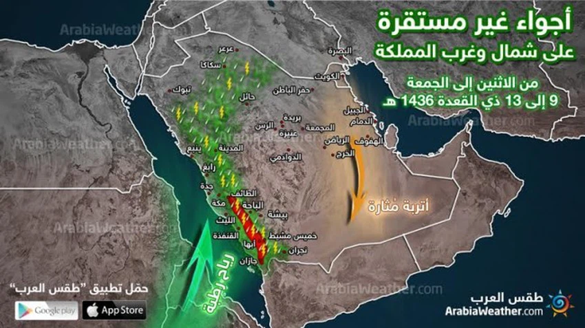 ويشير طقس العرب الى تأثر المناطق الجنوبية الغربية من البلاد بحالة قوية من عدم الاستقرار الجوي والتي تسببت تشكل السحب الرعدية الكثيفة المترافقة مع الامطار الرعدية الغزيرة وتساقط زخات البَرَد وتشكل السيول، والتي يتوقع ان تتراجع قليلا نهاية الاسبوع.