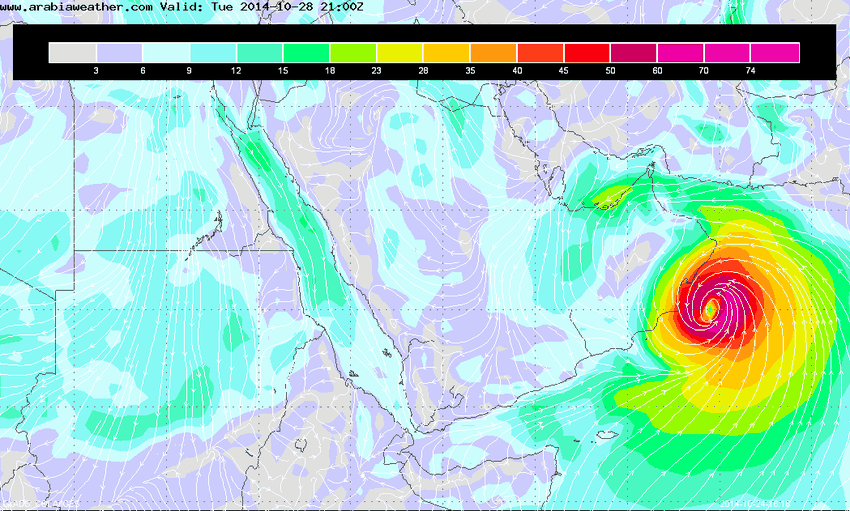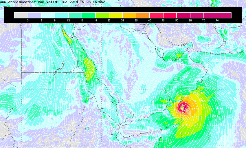 الموقع المُحتمل لـ نيلوفار وسرعة الرياح المرافقة يوم الثلاثاء القادم بحسب نموذج التنبؤات العددية ECMWF، وهو توقع قابل للتغيير مع التحديثات القادمة