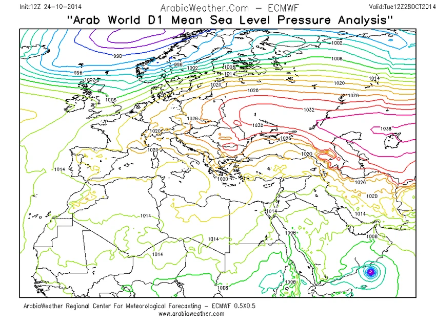 الموقع المُتوقع لمركز المُنخفض بحسب النموذج العددي ECMWF مساء الثلاثاء القادم، وهو توقع قابل للتغيير خلال التحديثات القادمة