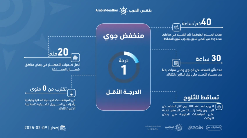 وخلال يوم الاثنين العاشر من شباط 2025 يستمر تأثر المملكة بالمُنخفض الجوي المُصنف من الدرجة الأولى، والمترافق مع كتلة هوائية باردة، وتستمر درجات الحرارة أقل من المعدل بحدود 2-4 درجات مئوية، ويكون الطقس باردًا وغائمًا جزئيًا إلى غائم أحيانًا، مع هطول الأمطار بين الحين والآخر في شمال ووسط وشرق المملكة، وتمتد أحيانًا نحو مرتفعات جنوب المملكة بمشيئة الله. وتكون الهطولات على شكل زخات من البرد في قمم الجبال العالية في جنوب المملكة خاصة مع ساعات الصباح.