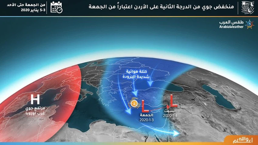 ويُتوقع بمشيئة الله ليلة الجمعة/السبت أن يعبر المملكة الجزء الأبرد وشبه الجاف من الكتلة الهوائية الباردة المرافقة للمنخفض الجوي، بحيث تسود أجواء شديدة البرودة لكن مع تساقطات مطرية محلية عشوائية، تكون ثلجية أحياناً "محدودة وغير مؤثرة" على الجبال العالية مثل جبال الشراة، الرشادية، الشوبك، رأس منيف، زي، وتلاع العلي وصويلح.
