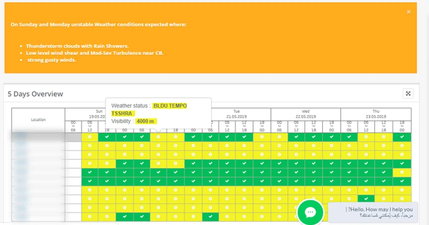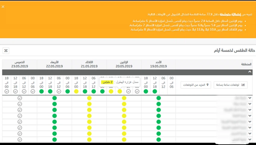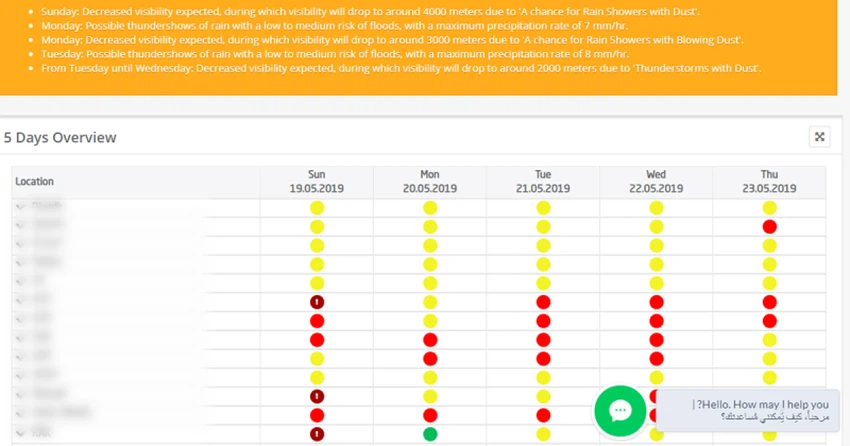 وكما تًوضح الصورة أعلاه يُزود نظام التبيه المبكر الخاص بالقطاع الجوي عملائنا في القطاع الجوي بكافة التنبيهات والظروف الجوية المُتوقعة لكل مطار من حيث تشكل الغبار أو الضباب والرؤية الأفقية الناجمة عنه وسرعة الرياح أو غزارة الأمطار، ويقوم بتفصيل الحالة الجوية في كل مطار بشكل دقيق وفي كل ساعه وتتغير هذه التوقعات بشكل دوري ودقيق وفقاً لآخر مخرجات الخوارزميات والأنظمة الداخلية والتي تقوم بتزويد البيانات لنظام الإنذار المبكر.
