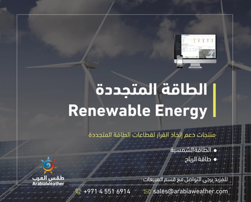 ونظراً لأهمية الطاقة والشمس في المملكة العربية السعودية، قُمنا باستحداث نظام خاص يقوم بمُراقبة تفصيل الحالة الجوية المُهمة من أجل انتاج الطاقة الشمسية أو طاقة الرياح، اذ يقوم هذا النظام بتزويد عملائنا بالفترات المُناسبة لاستحداث الطاقة والتوربينات الشمسية والفترة المُناسبة لها أو تنبيههم من بعض المخاطر أو الفترات التي تقل فيها درجات الحرارة اللازمة لانتاج الطاقة الشمسية، ويتمكن العميل من مراقبة الحالة الجوية ودرجات الحرارة عبر منصة خاصة.
