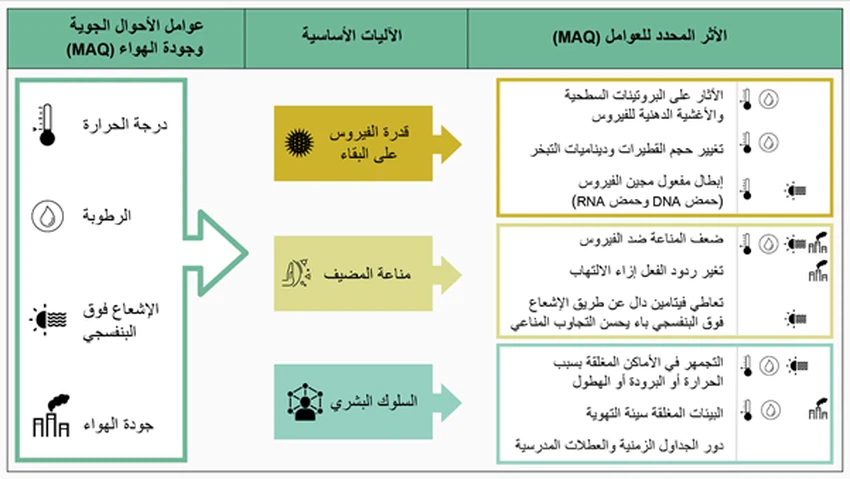 ويشير الملخص التنفيذي للتقرير إلى أن "الآليات الأساسية التي تجعل العدوى الفيروسية للجهاز التنفسي موسمية، ليست مفهومة جيداً حتى الآن... ولعل هناك مزيجاً من الآثار المباشرة على استمرار الفيروس، وعلى مقاومة الإنسان للعدوى، ومن الآثار غير المباشرة للطقس والمواسم عبر تغير السلوك البشري".