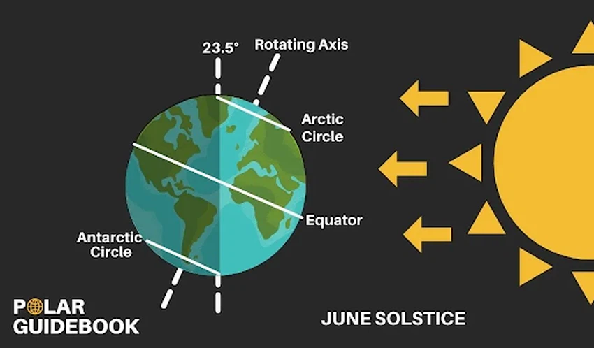 في نفس القطبين، تشرق الشمس مرة واحدة في السنة، حيث تبقى في السماء لمدة 6 أشهر قبل أن تغرب مرة واحدة سنويًا ولا تشرق مرة أخرى لمدة 6 أشهر.