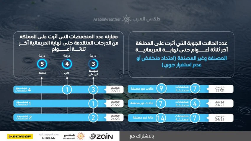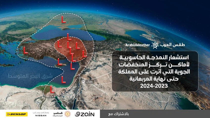 ارتفع عدد الحالات الجوية التي أثرت على الأردن في الموسم المطري الحالي 2023/2024 بشكل ملحوظ و كبير بالمُقارنة عما كان عليه الحال في الموسمين الماضيين 2022/2023 و 2021/2022، حيث تأثرت المملكة هذا الموسم حتى نهاية المربعانية بحوالي 21 فعالية جوية توزعت ما بين 7 منخفضات جوية مُصنفة و أكثر من 14 حالة جوية غير مُصنفة (إما على شكل امتداد منخفض جوي أو حالات من عدم الاستقرار الجوي). في حين و إن أخذنا عدد المُنخفضات الجوية ذات الدرجة الثالثة أو أعلى (المنخفضات الجوية القوية التي تجلب كميات مُعتبرة من الأمطار لعموم المناطق) سنجد أن الموسم الحالي افتقر لوجود مُنخفضات جوية قوية كما هو مُوضّح أدناه و هو على غرار الموسم الماضي.