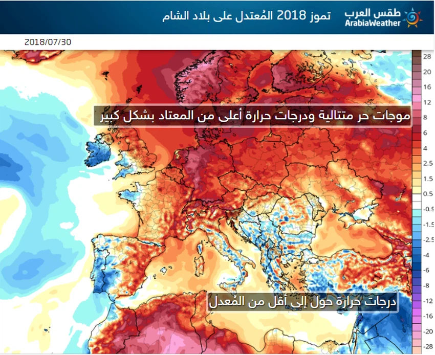 الخارطة المُرفقة تعبيرية، وتُظهر اختلاف درجات الحرارة عن معدلاتها مع الأيام الأخيرة من الشهر، ويتوضح أن درجات الحرارة أقل من معدلاتها في بلاد الشام، في حين ما زالت أجزاء واسعة من القارة الأوروبية تعيش على وقع أجواء أكثر حرارة من المعتاد وبشكل لافت.