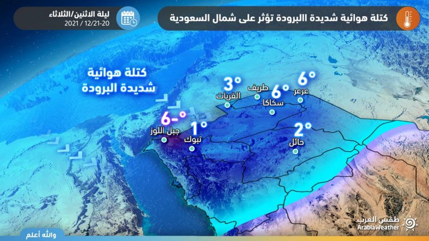 ويُتوقع أن تُسجل الأجزاء الشمالية من المملكة وبشكل خاص منطقة تبوك درجات حرارة حول الصفر المئوي ليلة الإثنين/الثلاثاء، في حين تصل إلى 6 درجات مئوية تحت الصفر في جبل اللوز، وترتفع عن ذلك بقليل في حائل والقريات لتكون مابين 2-3 درجات مئوية، وتكون حول 6 درجات مئوية في عرعر وسكاكا، مهو ما يعني سيطرة طقس شديد البرودة يستلزم ارتداء الملابس الشتوية واستخدام وسائل التدفئة.