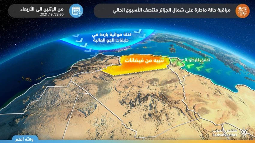 وفي التفاصيل، يُراقب كادر التنبؤات الجوية في غرفة العمليات في طقس العرب حالة ماطرة مُحتملة على شمال الجزائر مُنتصف الأسبوع الحالي، نتيجة اندفاع حوض علوي بارد من غرب اوروبا بالتزامن مع وصول تيارات هوائية رطبة من الشرق، تعمل على نشوء اضطرابات جوية قوية على المناطق الشمالية تبدأ يوم الاثنين، وتشتد ليلة الثلاثاء/الأربعاء وسط تحذيرات جدية من احتمالية تعرض بعض هذه المناطق للسيول الجارفة نظراً لغزارة الهطول المطري المتوقع في بعض الولايات من الشمال الجزائري.