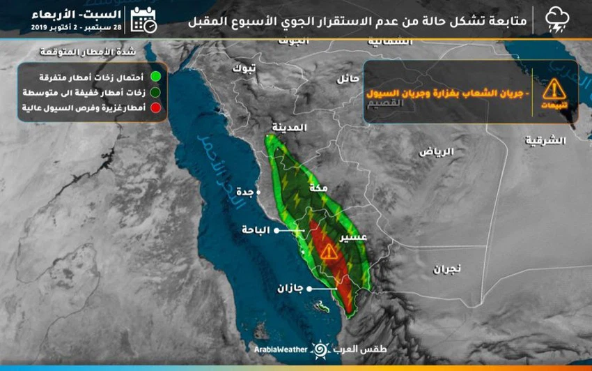 وبحسب قسم التنبؤات الجوية المختص بالحالات الجوية فان المملكة على موعد مع أحوال جوية غير مستقرة في مختلف المناطق الجنوبية الغربية اعتباراً من مطلع الأسبوع وبشكل تدريجي بحيث تهطل زخات رعدية من الأمطار في مرتفعات عسير وجازان وأجزاء من الباحة ونجران تكون متوسطة الشدة بشكل عام ، وتشتد الحالة الجوية خلال منتصف الأسبوع المقبل مع امتدادها شمالاً الى الطائف ، مكة المكرمة وأجزاء من المدينة المنورة ، وتكون طبيعة الهطولات المطرية حينها متوسطة الى غزيرة الشدة تترافق مع هطول البرد بشكل محلي مع تنبيه مرتفع من تشكل السيول في بعض المناطق.
