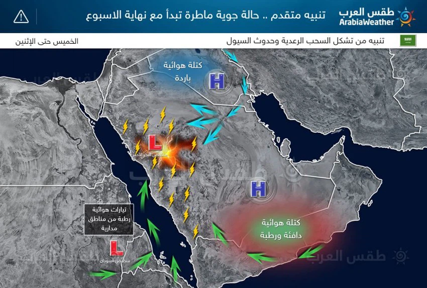وتبدأ السحب الرعدية بالتكاثر اعتبارا من يوم الخميس 25 أبريل، في جنوب غرب المملكة لاسيما المرتفعات والتي قد تصل للطائف وربما مكة المكرمة،