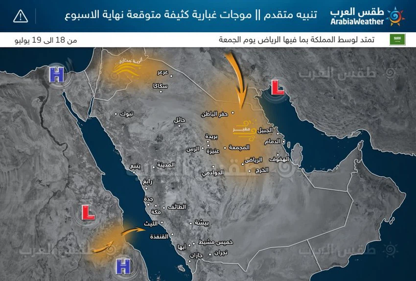 يتوقع أن تتعرض حفر الباطن والأجزاء الداخلية من المنطقة الشرقية وربما الهفوف الى غبار كثيف أحياناً يومي الخميس والجمعة 18 و19 يوليو 2019، فيما تمتد موجات الغبار (بحدة متوسطة وقد تصبح كثيفة بشكل محلي) نحو أجزاء من وسط المملكة تشمل العاصمة الرياض إضافة الى أجزاء من شرق القصيم والمجمعة.