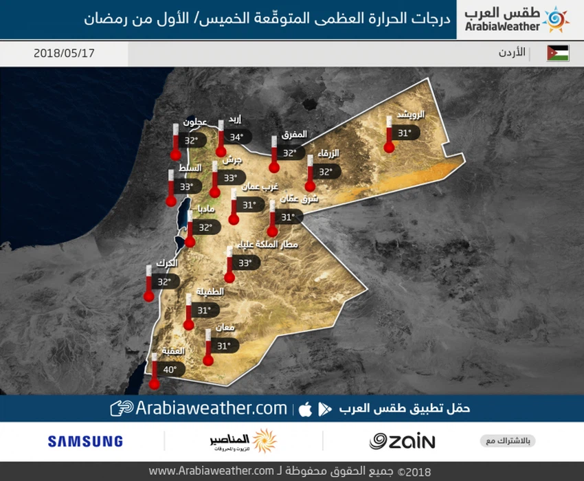 وتسود أجواء حارة نسبياً ومُغبرة بشكل متفاوت في عموم المناطق، وحارة في مناطق الأغوار والبحر الميت والعقبة.