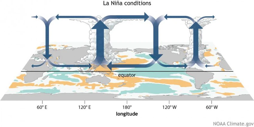 وأضافوا أن لظاهرة اللانينا تأثير على عدد من الظواهر القوية في الطقس حول العالم من بينها تزايد في نشاط أعاصير المحيط الأطلسي، ويمتد أيضاً تأثيرها نحو المحيط الهندي، ولا تُعتبر ظاهرة اللانينا مُجرد ظاهرة مُحيطية ولكنها تفاعل بين المحيط والغلاف الجوي عبر آلية تُعرف بدورة ووكر (Walker Circulation) :