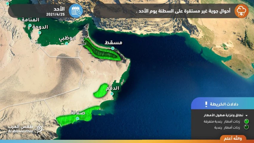 مع ساعات نهار الأحد يُتوقع أن تبدأ الأجواء غير المستقرة تؤثر على سلسلة مرتفعات جبال الحجر، تعمل على تكاثر السحب الركامية الرعدية وتساقط الأمطار بشدة متفاوتة، وتتسع بشكل تدريجي خلال الأسبوع لتشمل أجزاء واسعة من السلطنة لاسيما المنطقة الشمالية والمناطق الساحلية، وتَتَرافق بهطولات مطرية مُتوسطة وغزيرة، وتَتَرافق كذلك بالعواصف الرعدية ورُبما زخات من البَرَد اضافة لنشاط الرياح الهابطة المثيرة للأتربة والغبار.