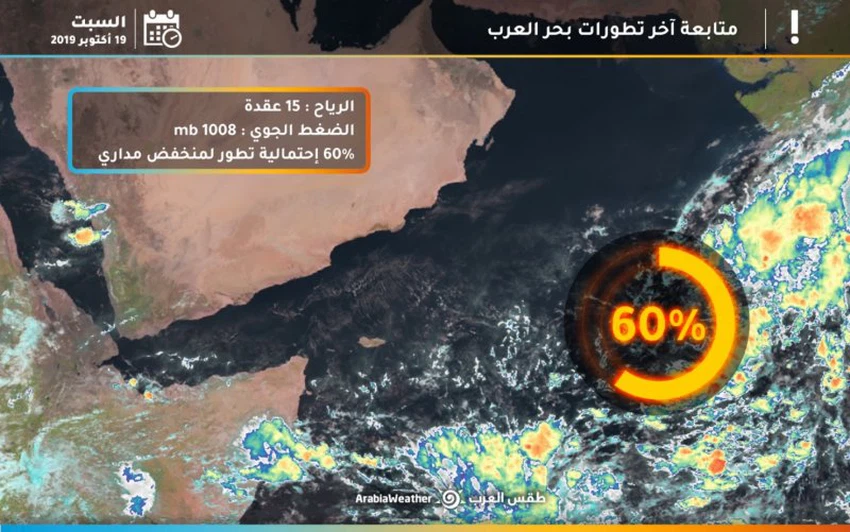 طقس العرب - م. ناصر حداد – تستمر مراقبة اضطرابات بحر العرب، اذ تشير صور الأقمار الاصطناعية والتقارير الرسمية الى تواجد حزم من السحب الرعدية في بحر العرب، مع توقعات بتطورها وتشكل اضطراب مداري في النصف الثاني من هذا الأسبوع.