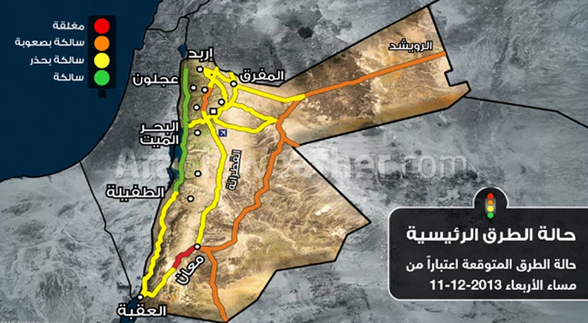 لذا يتوقع أن تكون حالة طريق رأس النقب مُغلقة بسبب تراكم الثلوج كما تكون الطرق الرئيسية في أعالي محافظات جرش و عجلون و شمال العاصمة عمّان سالكة بصعوبة لنفس السبب.