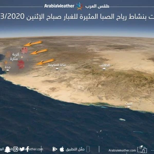طقس العرب - سنان خلف - تتأثر مدينة جدة بمشيئة الله، وبشكل خاص الأجزاء الشرقية منها بهبوب رياح شرقية نشطة مع هبات قوية أحياناً صباح الإثنين، يُتوقع ان تعمل على إثارة الأتربة والغبار.