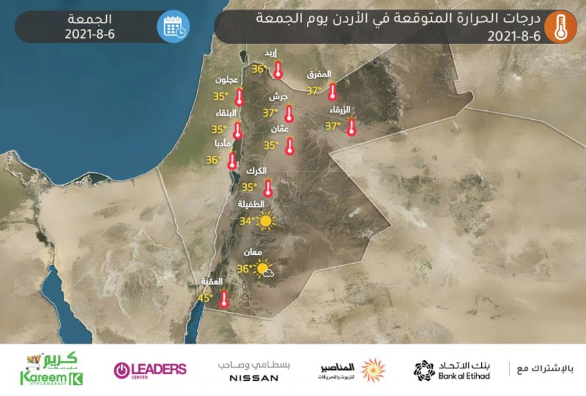 طقس العرب - يتوقع ان يتراجع قليلاً تأثير الكتلة الهوائية الحارة عن المملكة يوم الجمعة عدا مناطق الأغوار الوسطى والجنوبية بما فيها البحر الميت وغور الصافي بالإضافة إلى العقبة حيث يُتوقع أن يزداد تأثر هذه المناطق بالكتلة الهوائية الحارة ويكون تأثيرهاً شديداً، لتبقى درجات الحرارة أعلى من معدلاتها ما بين 3-5 درجات مئوية، ليتحول الطقس ليُصبح حاراً في أغلب المناطق، مع استمراره شديد الحرارة في مناطق الاغوار الشمالية والبادية، بينما يكون الطقس لاهباً في مناطق الأغوار الوسطى والجنوبية بما فيها البحر الميت وغور الصافي بالإضافة إلى مدينة العقبة، حيث لا يُستبعد أن تتجاوز درجات الحرارة في بعض من تلك المناطق حاجز الـ 45 درجة مئوية، وفي حين يتوقع ان تظهر كميات من السحب المُتوسطة والعالية في جنوب وشرق المملكة في ساعات ما بعد الظهر، مع إحتمال هطول زخات محلية من المطر في مناطق البادية وخاصة الشرقية