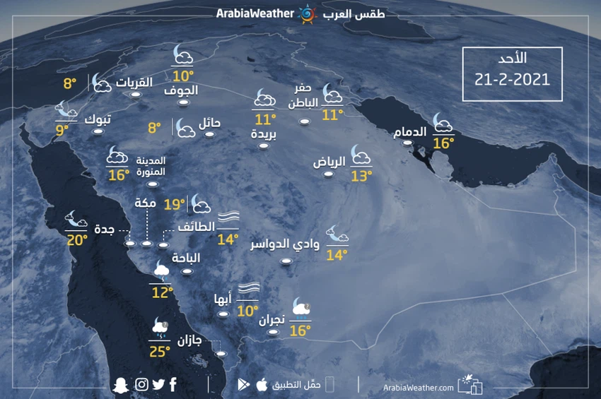 طقس العرب - من المتوقع أن يكون الطقس يوم الأحد في السعودية بمشيئة الله على النحو التالي: