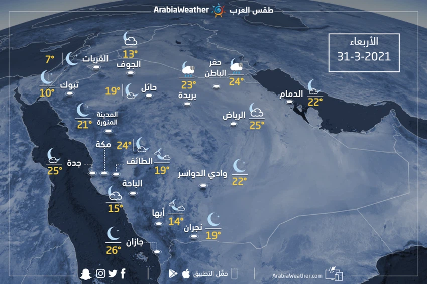 طقس العرب - يكون الطقس يوم الأربعاء في المملكة على النحو الآتي: