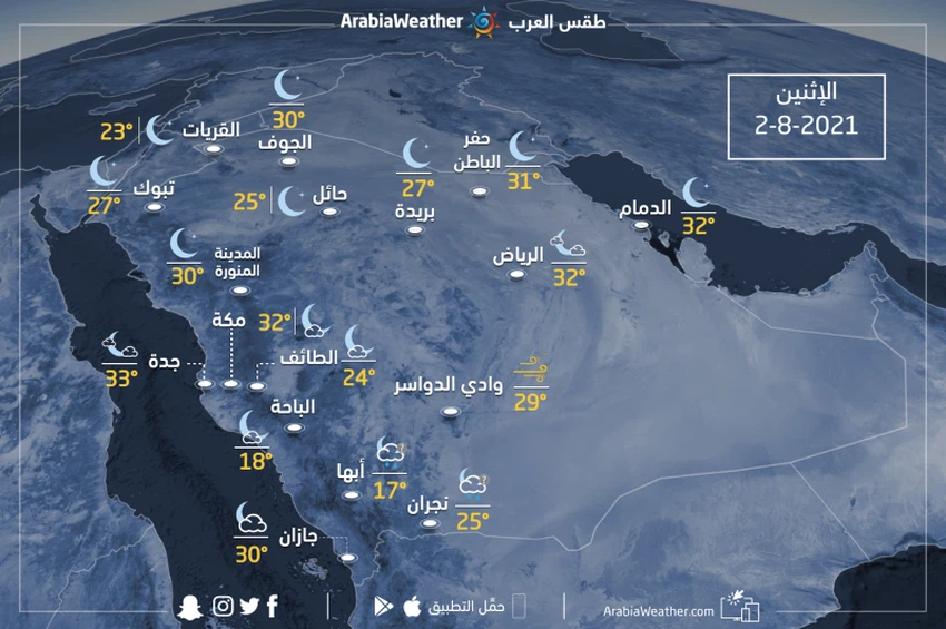 طقس العرب - يتوقع ان يبقى الطقس يوم الاثنين في السعودية حار إلى شديد الحرارة في عموم المناطق بينما يكون معتدلاً فوق المرتفعات الجنوبية الغربية، كما ويتوقع ان تبقى الفرصة مهيأة لهطول زخات رعدية من الامطار تكون محلية الطابع والشدة على اجزاء من جنوب وجنوب غرب وغرب المملكة، واجزاء من الربع الخالي، كما وتبقى الاحتمالية واردة لهطول زخات رعدية ومتفرقة ومحلية من الامطار على أجزاء من الربع الخالي وجنوب المنطقة الشرقية وجنوب منطقة الرياض إدارياً، وفي حين تكون الرياح خفيفة إلى معتدلة السرعة في عموم المناطق بينما تكون شمالية الى شمالية غربية نشطة على أجزاء من المناطق الغربية والجنوبية الغربية إضافة لغرب وجنوب منطقة الرياض إدارياً والتي تعمل على اثارة الغبار والاتربة.