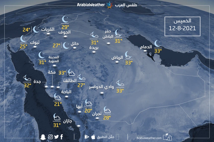 حالة الطقس ودرجات الحرارة المتوقعة في السعودية يوم الخميس 12-8-2021