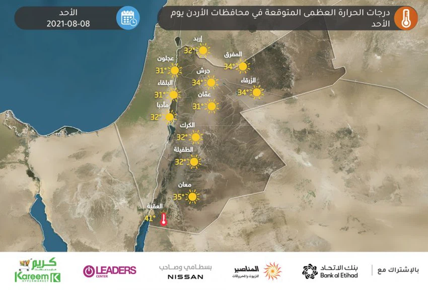 طقس العرب - يتراجع تأثير الكتلة الهوائية الحارة عن المملكة، بحيث تنخفض درجات الحرارة لتصبح حول معدلاتها لمثل هذا الوقت من العام، وتيوقع ان يكون الطقس حاراً نسبياً في الجبال، بينما يستمر شديد الحرارة في مناطق الاغوار والبحر الميت والعقبة والبادية، وفي حين تكون الرياح شمالية غربية معتدلة السرعة، تنشط على فترات و تؤدي إلى إثارة الغبار خاصة في المناطق الصحراوية.