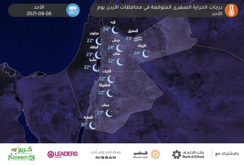 يتوقع ان تنخفض درجات الحرارة ليلاً لتصبح الأجواء معتدلة في الجبال والسهول، ودافئة في الأغوار والبحر الميت والعقبة، كما وترتفع نسب الرطوبة السطحية وتتشكل الغيوم المنخفضة في المنطقة الشمالية والوسطى وجبال الشراه، وفي حين تكون الرياح شمالية غربية مُعتدلة السرعة، تنشط أحياناً.