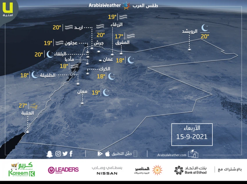 طقس العرب - من المتوقع تبقى درجات الحرارة حول معدلاتها لمثل هذا الوقت من العام، حيث يسود طقس صيفي اعتيادي إلى حار نسبيا في عموم مناطق المملكة، وفي حين الرياح تكون شمالية غربية معتدلة السرعة في عموم المناطق، تؤدي إلى إثارة الغبار خاصة في المناطق الصحراوية.