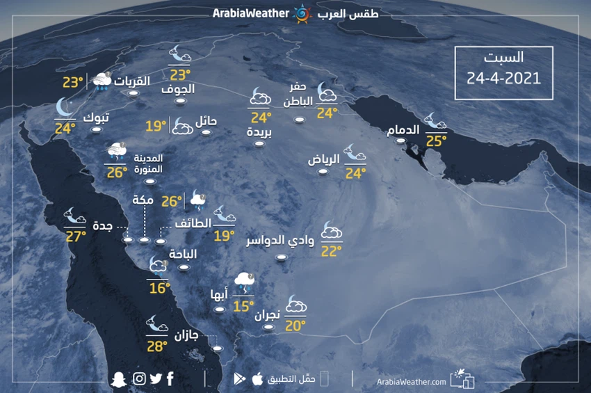 فرصة لزخات رعدية من الامطار على أجزاء من جنوب غرب وغرب وشمال ووسط المملكة وذلك مع ساعات ما بعد الظهر والمساء، تترافق بنشاط الرياح السطحية المثيرة للغبار في بعض من هذه المناطق.