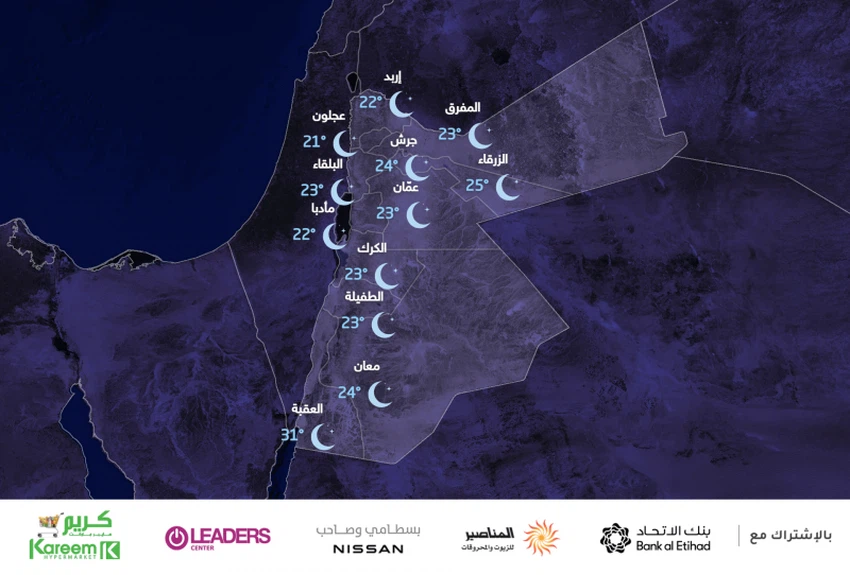 طقس العرب - يطرأ ارتفاع طفيف آخرعلى درجات الحرارة و تستمر أعلى من مُعدلاتها لمثل هذا الوقت من العام بقليل، كماو يتحول الطقس ليُصبح حاراً نسبياً في أغلب المناطق، في حين يُصبح الطقس شديد الحرارة في مناطق الاغوار والبحر الميت والعقبة و مناطق البادية، وفي حين تكون الرياح تكون شمالية غربية معتدلة السرعة، تنشط بعد الظهر و قد تؤدي إلى إثارة الغبار.