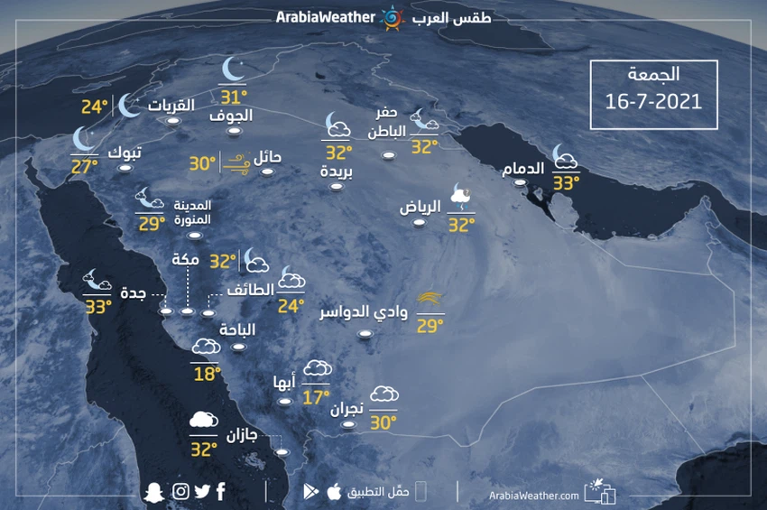 طقس العرب - يتوقع ان يبقى الطقس يوم الجمعة في السعودية حار إلى شديد الحرارة في عموم المناطق ومعتدلاً فوق المرتفعات الجنوبية الغربية، وتبقى الفرصة مهيأة لهطول زخات رعدية ومحلية الطابع والشدة على اجزاء من جنوب غرب وجنوب المملكة وجنوب المنطقة الشرقية، كما يتوقع أن تشمل أجزاء من أقصى جنوب منطقة الرياض إدارياً وقد تمتد فرص الأمطار لتشمل العاصمة الرياض، كما ويتوقع أن تكون الامطار الرعدية غزيرة على اجزاء من جنوب وجنوب غرب المملكة تترافق بزخات من البَرَد وتشكل السيول والتجمعات المائية أحياناً، وفي حين تكون الرياح شمالية شرقية نشطة السرعة على أجزاء من جنوب وجنوب غرب المملكة وجنوب منطقة الرياض إدارياً تثير هذه الرياح الغبار والأتربة بينما تكون الرياح شمالية غربية نشطة على المناطق الغربية وسواحل البحر الاحمر.