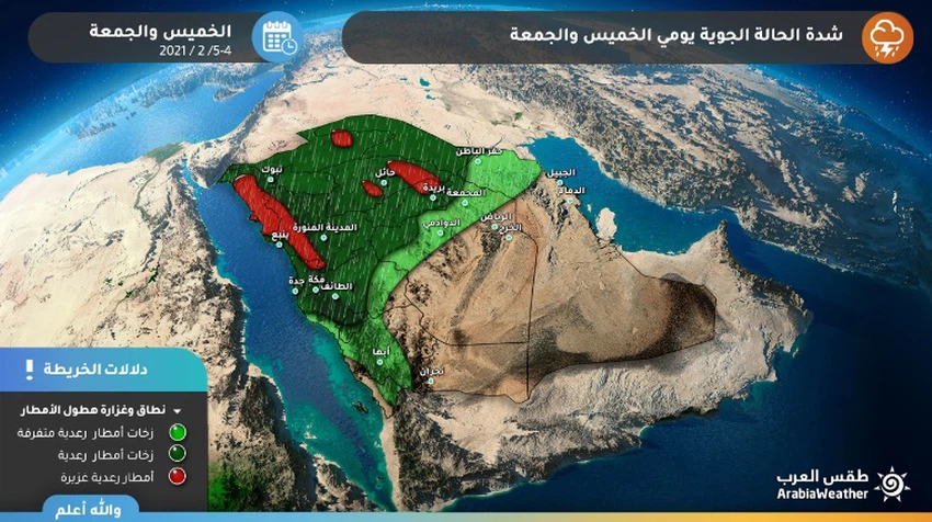 وتبدأ أولى الاضطرابات الجوية بمشيئة الله ليلة الأربعاء/الخميس أجزاء من سواحل ومرتفعات منطقة تبوك، لتتسع رقعة الامطار خلال يوم الخميس وتشكل عموم منطقة تبوك بما فيها المدينة إضافة الى الجوف وغرب الحدود الشمالية وأجزاء من حائل والمدينة المنورة، وتكون الامطار يوم الخميس غزيرة فوق مرتفعات وسواحل تبوك مع هطول زخات البرد ونشاط الرياح السطحية اثناء هبوب العواصف الرعدية، فيما تكون متوسطة الشدة أحيانا في باقي المناطق مع احتمال تشكل التجمعات المائية، فيما يتوقع ان تصل الامطار لسواحل ينبع عصر ومساء الخميس وتكون متوسطة الشدة عموماً.